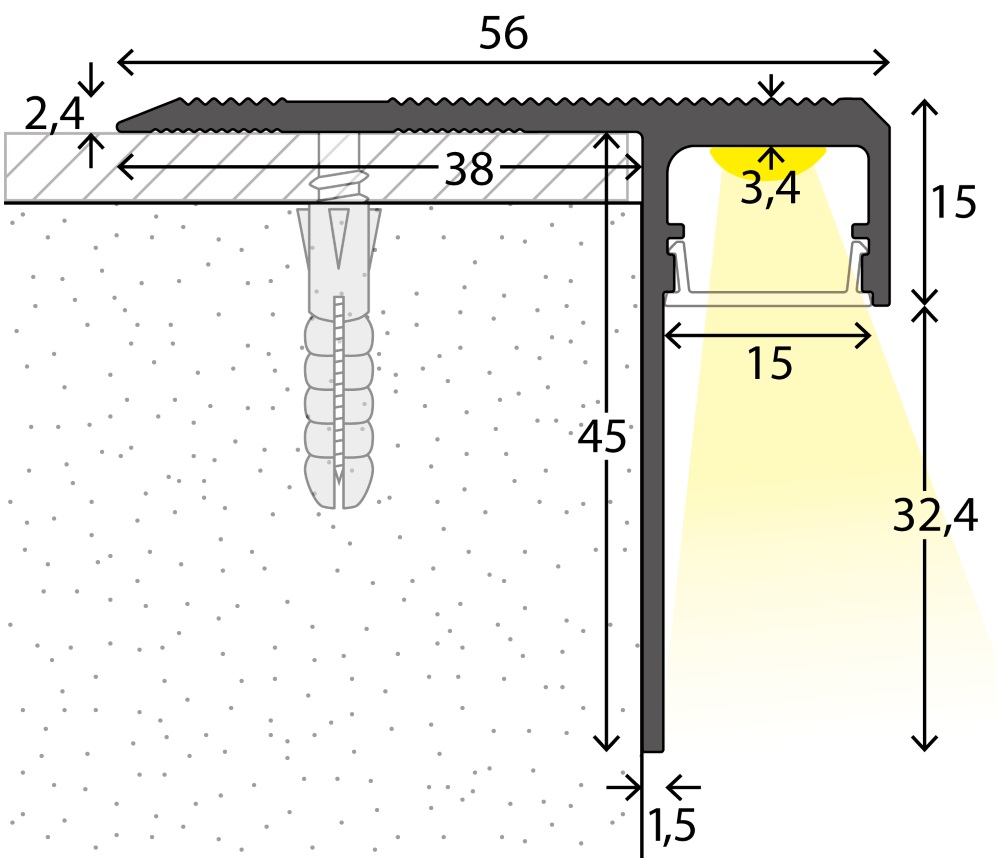 Das Profil wird auf die wie vor genannten Stufenkanten mittels geeigneter Dübel und Senkkopfschrauben passgenau auf die vorhandenen Stufen über dem verlegten Bodenbelag aufgeschraubt. Vergewissern Sie sich das etwas Platz für mögliche Kabelverlegungen für die