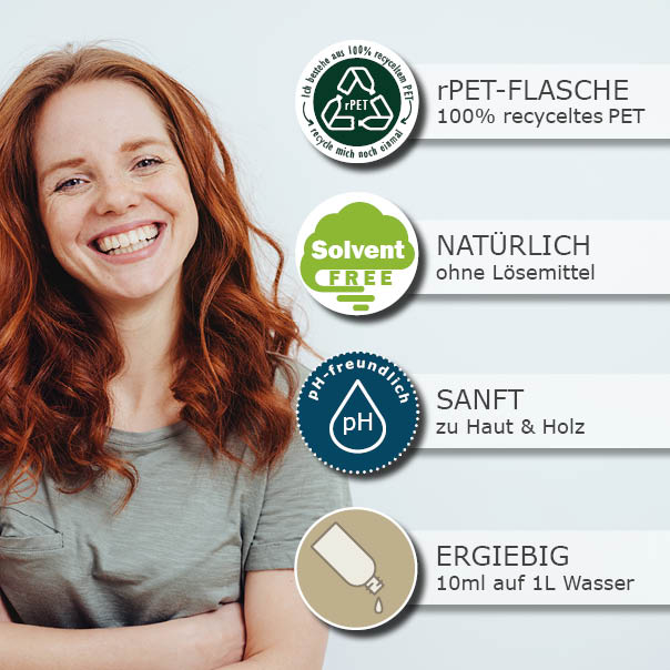 Das ergiebige 1-Liter-Konzentrat hat es in sich und reicht für viele Anwendungen. Für normale Verschmutzungen einfach eine Dosierkappe (Deckel) in je ein Liter Wasser geben und damit die gewünschte Oberfläche reinigen. Bei starken Verschmutzungen kann man die Holzseife auch pur anwenden. Vor dem Gebrauch bitte schütteln, da es Rohstoffbedingt zur Entmischung in der Flasche kommen kann.