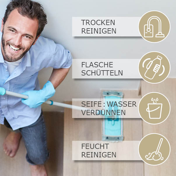 - Den Wischmopp oder das Tuch in die Seifenlösung tauchen, gründlich auswringen und die Oberfläche nebelfeucht wischen (keine Pfützen stehen lassen)