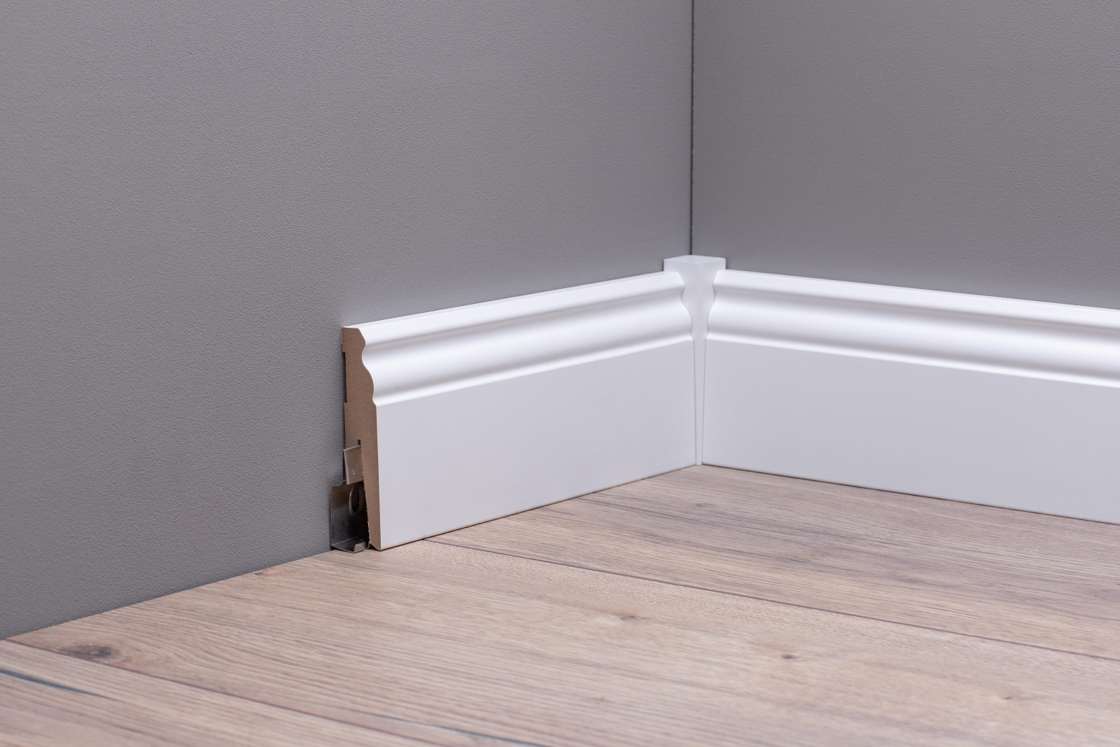 Unsere weiße Sockelleiste im klassischen Kölner Profil, verschönert durch Ihren schlichten und zeitlosen Stil, jeden Raum.