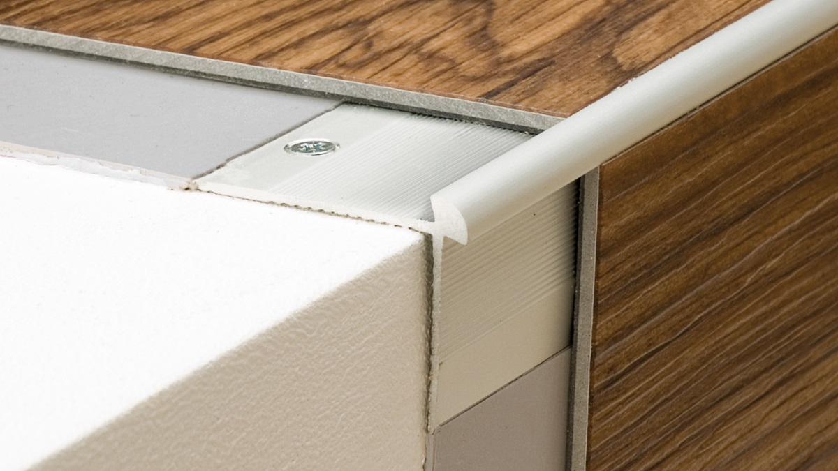 Treppenkantenprofil für Designbeläge bis 2,5 mm, für die vollflächige Verlegung von Designbelägen auf Treppenstufen. Die darauf abgestimmten Profile schützen die Kanten des Belags.