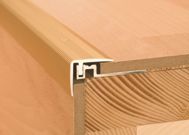 Das Treppenkantenprofil - Gold mit Schraubsystem, ist konstruiert für die Verarbeitung von Laminat, mehrschichtigen modularen Belägen sowie Parkett mit Belagsstärken von 7 - 15mm.