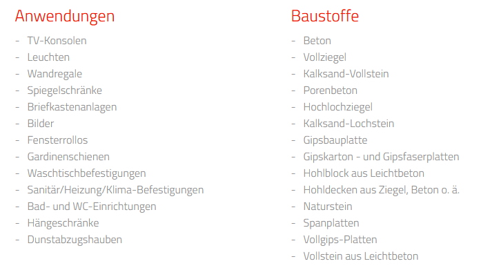 - Grundkörper aus hochwertigem Nylon aktiviert je nach Baustoff automatisch das optimale Funktionsprinzip für dauerhafte und sichere Befestigung.