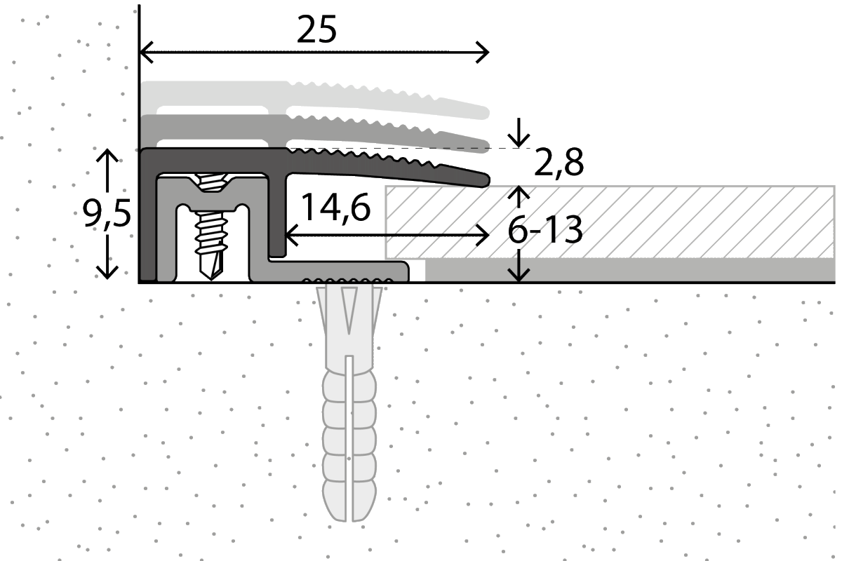 Das Aluminium - Clipsprofilsystem ist konstruiert für Belagstärken von 6 bis 13 mm. Mit dem Erhöhungsblock können sie sogar Belagsstärken bis 18mm abdecken.