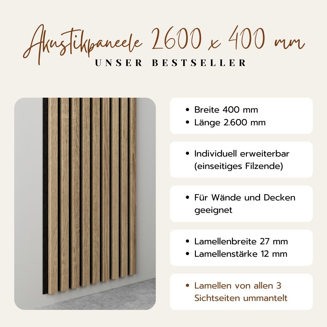 - Deutlich edler als herkömmliche Akustikpaneele mit sichtbaren MDF-Kanten