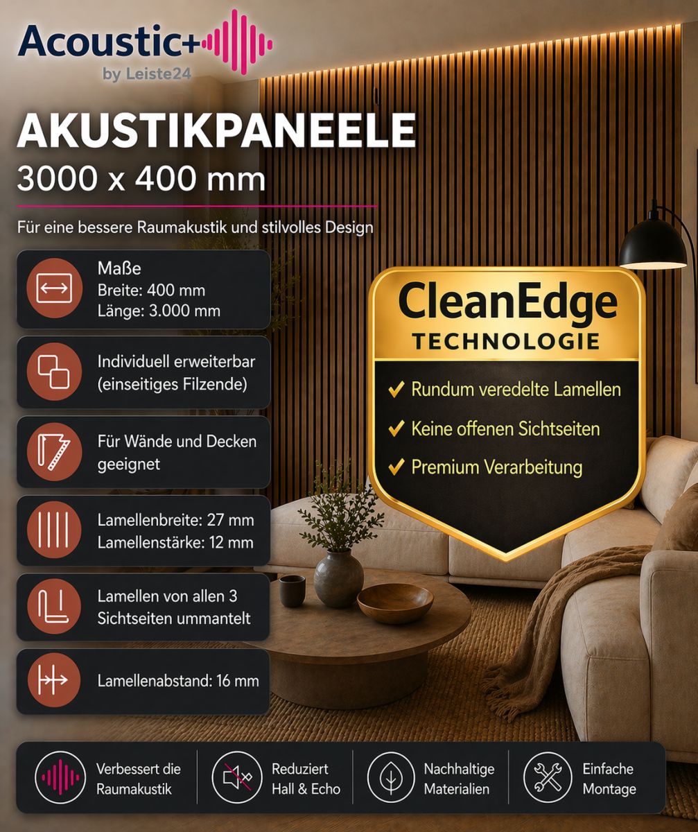 Großformatige Acoustic+ Akustikpaneele im Maß 3000 x 400 mm sorgen für eine besonders ruhige, durchgängige Wandoptik ohne störende Übergänge. Die Kombination aus moderner Lamellenoptik, funktionaler Schalldämmung und CleanEdge-Technologie macht sie zur idealen Lösung für hochwertige Wandgestaltungen.