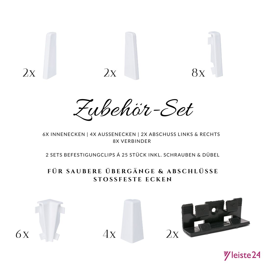 Das Aktionspaket beeinhaltet passendes Zubehör für MDF-Sockelleisten 60mm. Mit den Befestigungsclips lassen sich die Sockelleisten schnell und einfach montieren und bei Bedarf auch zerstörungsfrei wieder demontieren. Außerdem haben Sie die Möglichkeit der versteckten Kabelverlegung hinter der Wand. Durch die praktischen Ecken, Abschlüsse und Verbinder mit Stecksystem schaffen Sie ein optisch ansprechendes Raumbild.