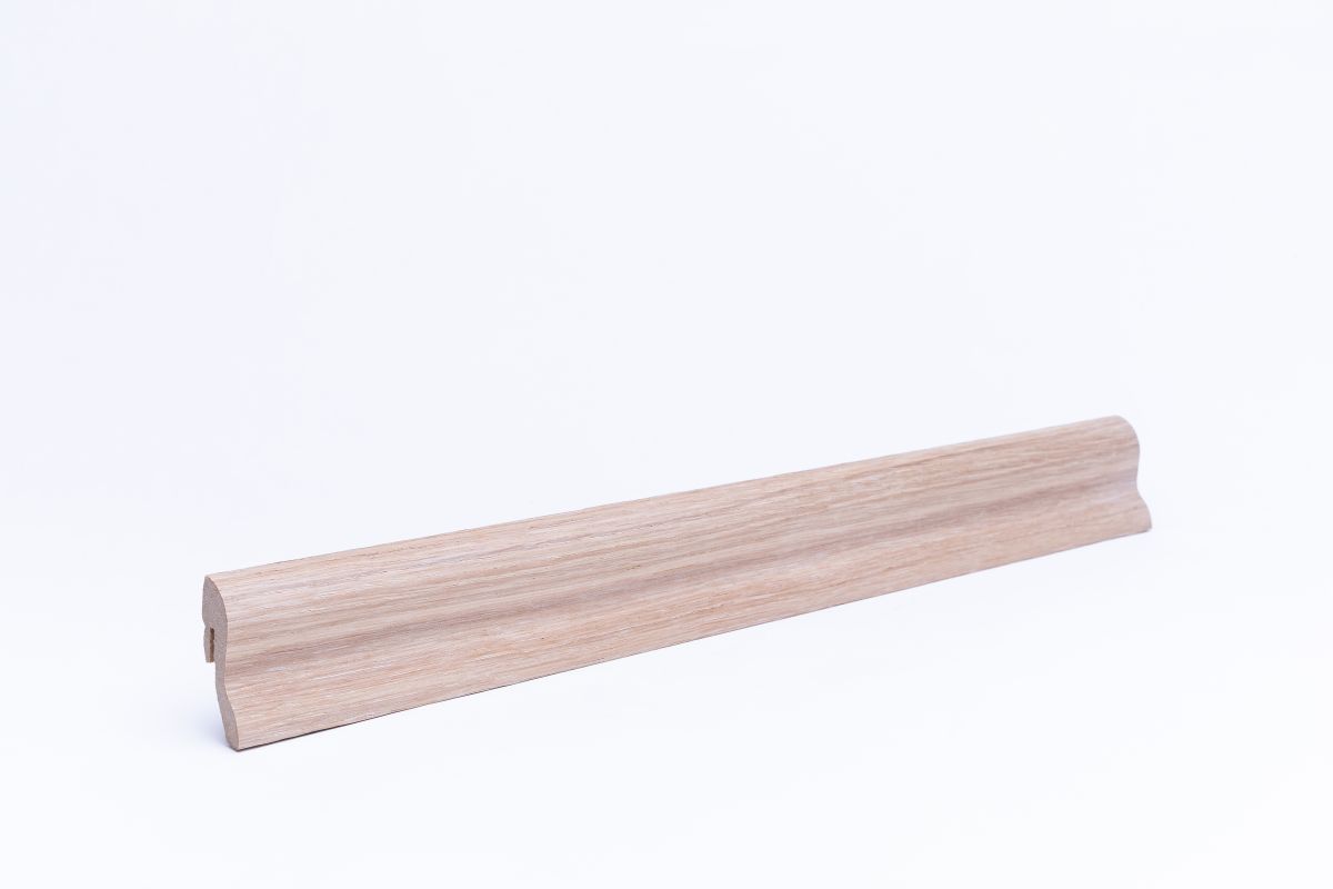 Die Sockelleiste ist mit Echtholz in Eiche furniert. Durch die Behandlung mit Holzöl , wirkt die Oberfläche wärmer und die natürliche Struktur des Eichenholzes kommt besonders zur Geltung. Das Öl zieht in die Holzporen ein, womit es beständiger gegen Staub, Schmutz und Feuchtigkeit wirkt. Zudem sind unsere Leisten leichter und flexibler als Furnier-Sockelleisten mit Holzkern und passen sich, auch bei leichten Unebenheiten, an Wand und Boden sehr gut an.