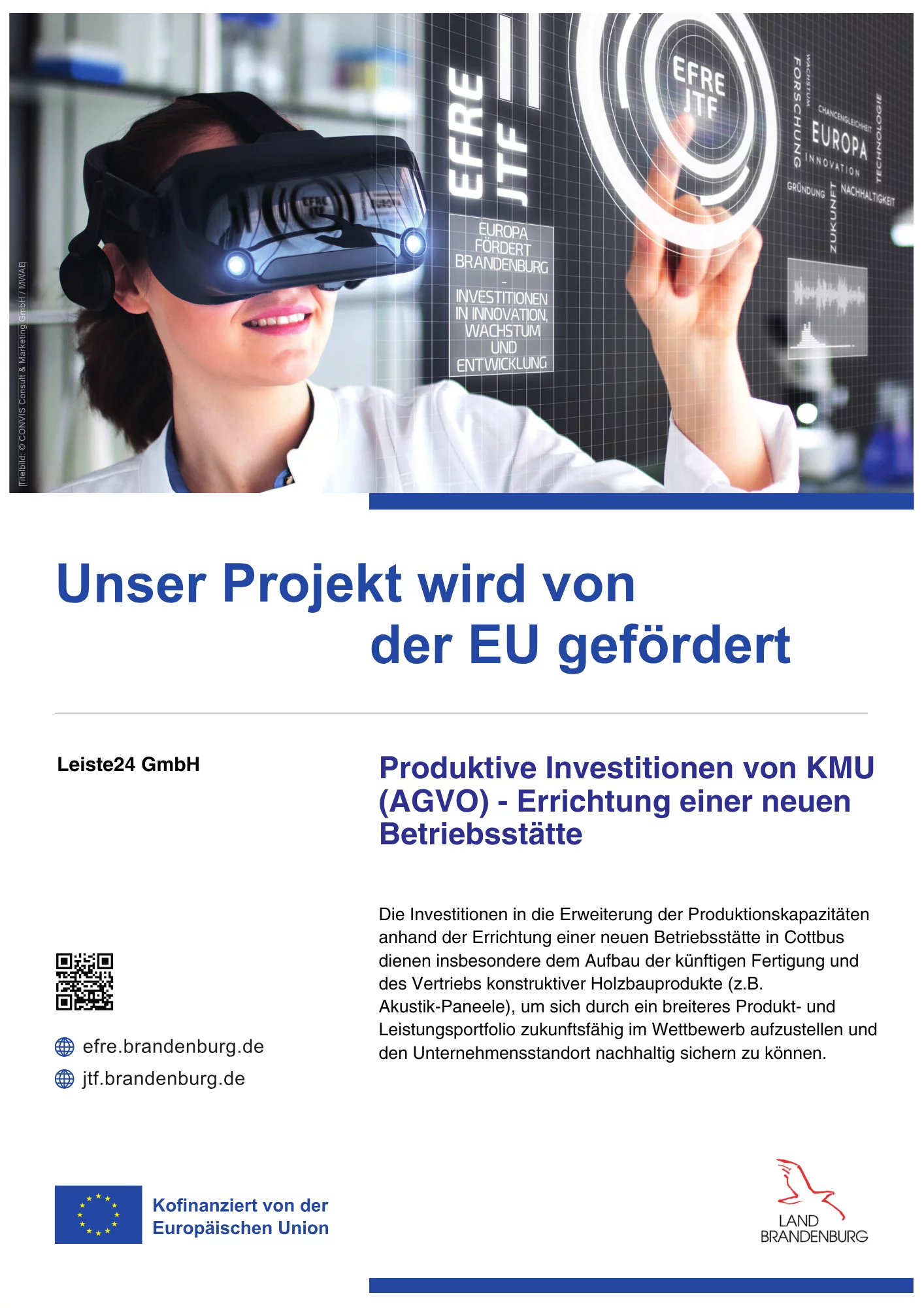 Umbau des vorhandenen Gebäudekomplexes und der Außenanlagen sowie Bau einer neuen Produktionshalle mit dem Ziel der Errichtung einer neuen Betriebsstätte zur Herstellung konstruktiver Holzbauprodukte. Mit dem Vorhaben sollen die Produktionskapazitäten der Leiste24 GmbH in Cottbus erweitert werden, um den Standort und die vorhandenen Arbeitsplätze langfristig zu sichern.