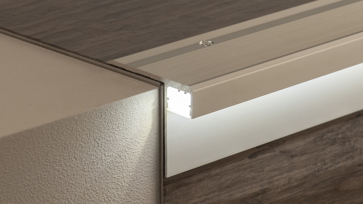 Das Treppenkantenprofil 218 verfügt über einen LED-Kanal, der das Licht nach unten abstrahlt. Die darunterliegende Stufe wird optimal ausgeleuchtet.