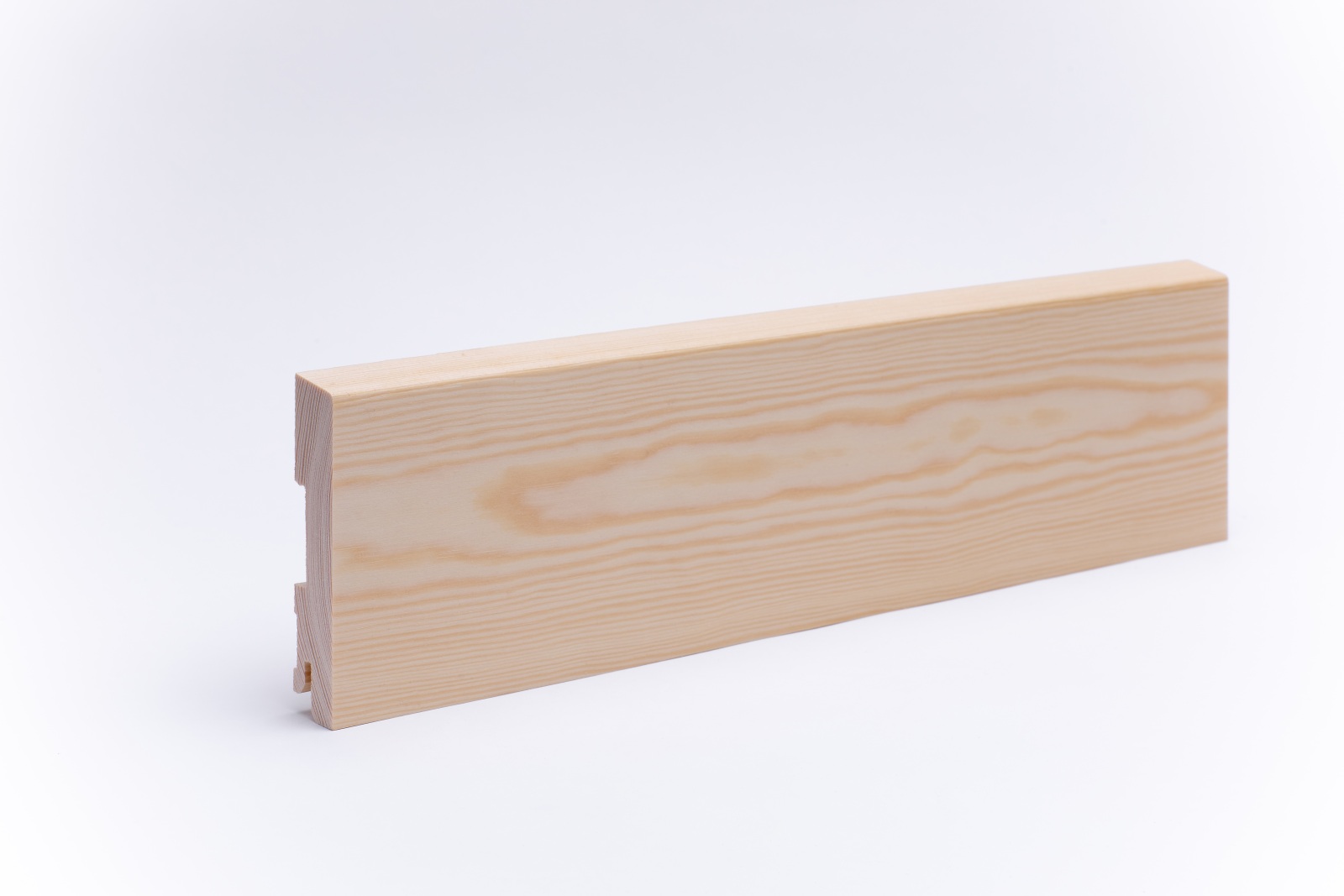 120 mm hohe Sockelleiste aus massivem Kiefernholz mit abgeschrägter Vorderkante. Gehobelt und geschliffen. Die Leisten werden aus einem Stück, wie der Stamm gewachsen ist, gearbeitet. Dadurch entsteht ein harmonisches Bild in der Holz- und Farbstruktur. Asteinschlüsse sind möglich.