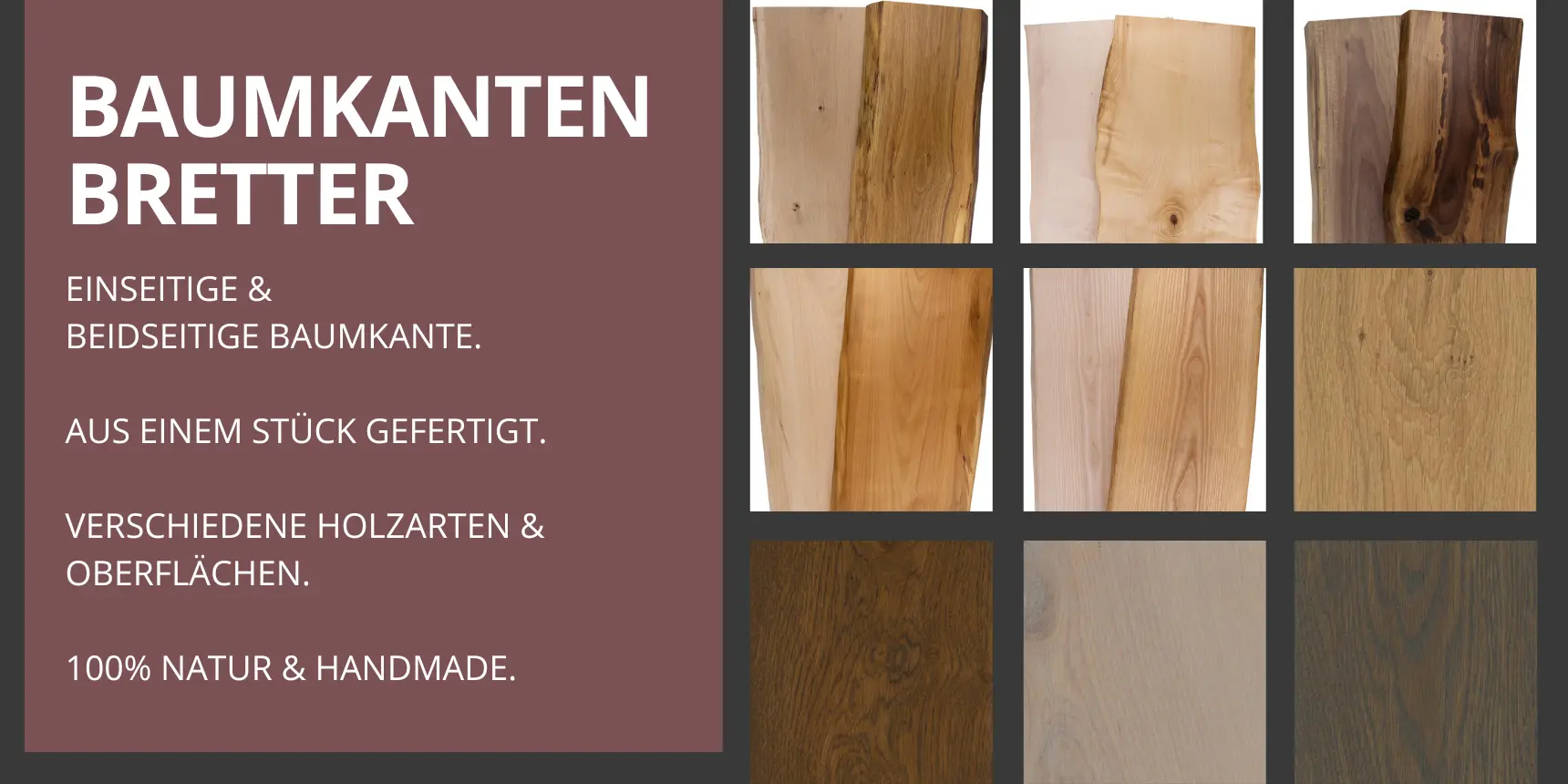 Entdecken Sie unsere vielseitige Auswahl an Baumkantenbrettern mit einseitiger Baumkante, verfügbar in verschiedenen Holzarten wie Eiche, Amerikanischem Nussbaum, Esche, Buche, Kiefer, Kirschbaum und Ahorn. Jedes Brett präsentiert die natürliche und unverwechselbare Textur des Holzes, ideal für maßgeschneiderte Möbelstücke oder Dekorationsprojekte, die einen Touch von Natürlichkeit und Robustheit verlangen. Unsere Baumkantenbretter sind in diversen Breiten und Längen erhältlich und bieten durch ihre einseitige Baumkante vielfältige Einsatzmöglichkeiten.