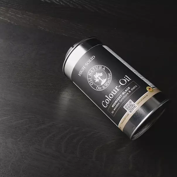 Das hochpigmentierte 2-Komponenten-Farböl von OLI-NATURA vereint beeindruckende Tiefe in der Farbwirkung mit hoher Schutzleistung für Holzoberflächen. Mit nur einem einzigen Auftrag färbt und schützt das Colour-Oil Midnight Black zuverlässig Möbel, Treppen oder andere Holzflächen im Innenbereich.