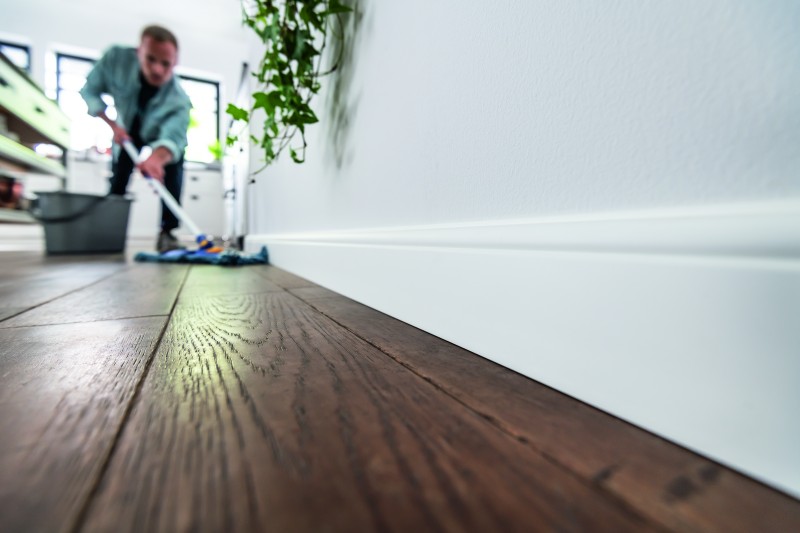 Die Montage der Espumo-Sockelleiste ist besonders schnell und einfach, da diese nur mit Montagekleber an der Wand befestigt wird. Durch eine versteckte Kabelführung besteht außerdem die Möglichkeit, störende Kabel verschwinden zu lassen.
