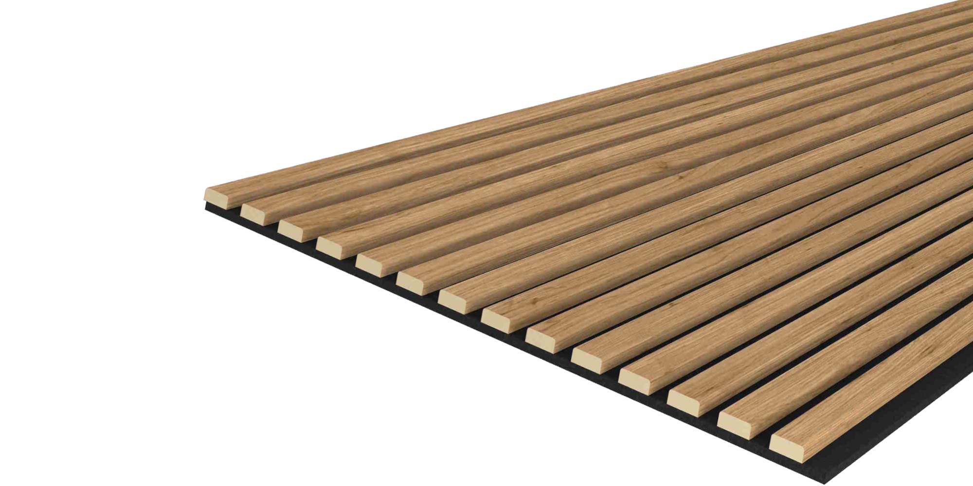 Acoustic+ Akustikpaneel 2600 x 400 mm Wildeiche - Akustikfilz Schwarz Hochwertige Akustikpaneele mit CleanEdge-Technologie - keine sichtbaren Kanten, moderne Lamellenoptik und spürbar bessere Raumakustik Verleihen Sie Ihren Räumen mehr Tiefe, Struktur und Ruhe. Die Acoustic+ Akustikpaneele von Leiste24 verbinden moderne Lamellenoptik mit funktionaler Schalldämmung und hochwertiger Verarbeitung. Ideal als Wandverkleidung für Wohnräume, Büros, Flure oder gewerbliche Bereiche. CleanEdge-Technologie - der sichtbare Unterschied Voll ummantelte Lamellen ohne offene Schnittkanten Saubere, hochwertige Optik aus jedem Blickwinkel Deutlich edler als herkömmliche Akustikpaneele mit sichtbaren MDF-Kanten Warum Acoustic+ Akustikpaneele von Leiste24? Verbessern die Raumakustik spürbar Moderne Lamellenwand-Optik für mehr Tiefe und Struktur Einfache Montage durch Kleben oder Schrauben Hochwertige Verarbeitung für langlebige Wandlösungen Produktdetails Lamellen aus MDF mit Qualitäts-Dekorkaschierung in Wildeiche Maße: 2600 x 400 x 20 mm Filz: Schwarz (8 mm stark) Material: MDF Maße der Lamellen: 27 mm breit und 12 mm stark Abstände zwischen den Lamellen: 18 mm Wandpaneele komplett vormontiert Montage Die Lamellenverkleidung ist sehr schnell und einfach zu montieren. Entweder Sie kleben oder schrauben die Akustikpaneele an die Wand. Für die Decke empfehlen wir Kleben und Schrauben in Kombination. Die perfekte Kombination aus Design und Funktion für Räume, die nicht nur gut aussehen, sondern sich auch besser anfühlen.