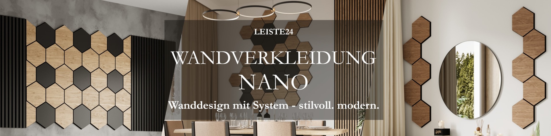 Die NANO Wandpaneele von Leiste24 stehen für clevere Raumgestaltung auf kleinstem Raum. Dank ihrer kompakten Form lassen sie sich flexibel kombinieren und ermöglichen moderne Designakzente mit klarer Linienführung. Ob als stilvolle Einzelmotive oder im System verlegt – NANO bringt Struktur, Stil und Persönlichkeit an Ihre Wände.